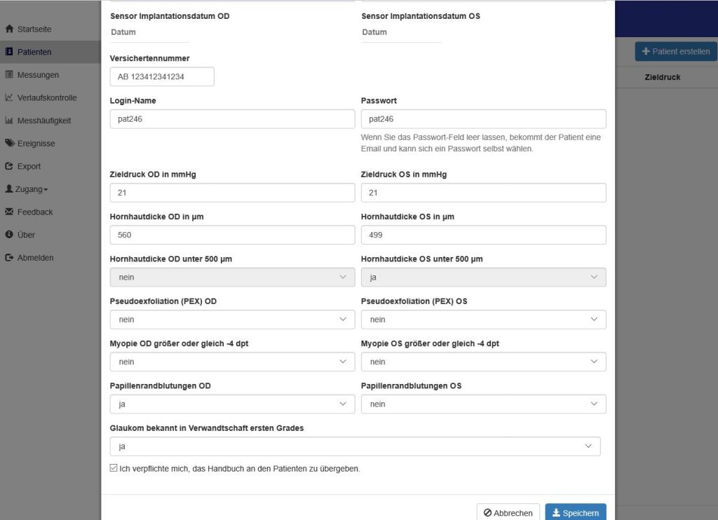 - automatische Speicherung von Augendruckwerten aus intraokulären Sensoren (ImplanData) nach Freigabe durch Patient