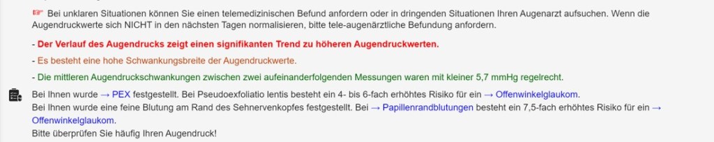 - Einfache Verhaltensempfehlungen, je nach Augendruckverlauf und eigenen Angaben