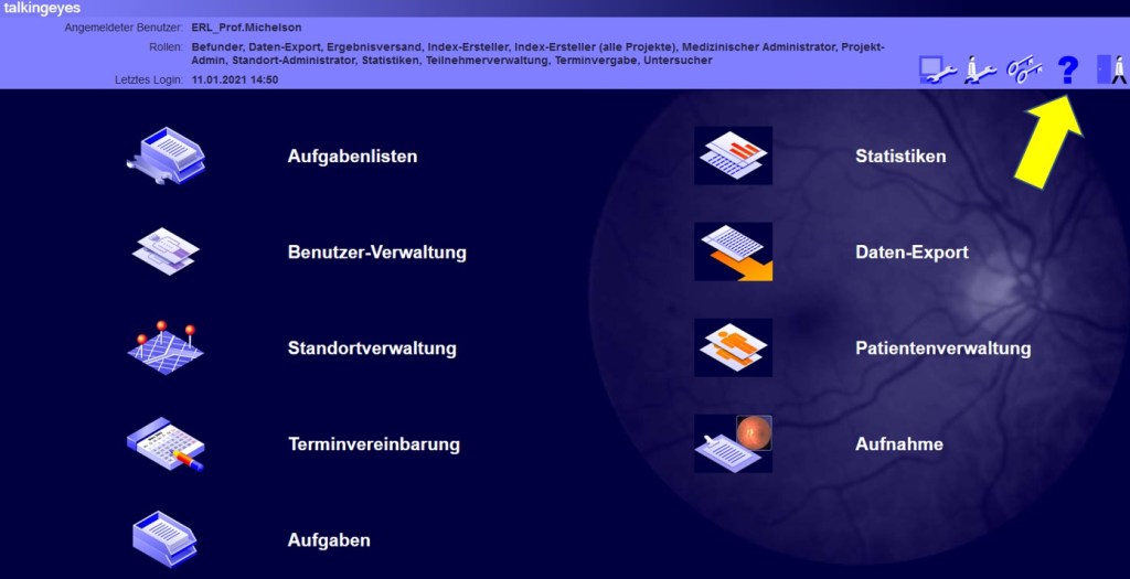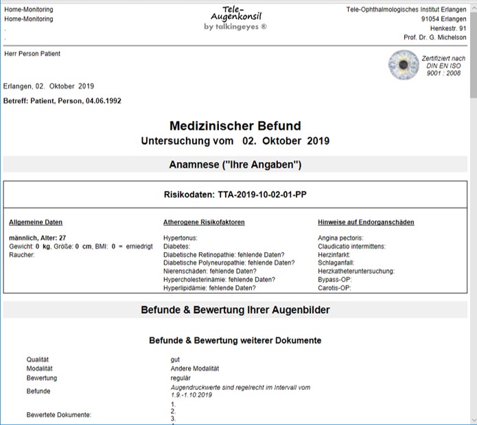 Das augenärztlich geleitete Tele-Ophthalmologische Institut übernimmt auf Wunsch des Patienten die ärztlichen Funktionen wie Übermittelung des Login und des Passwortes an den Patienen und die Dokumentation der Risikofaktoren.