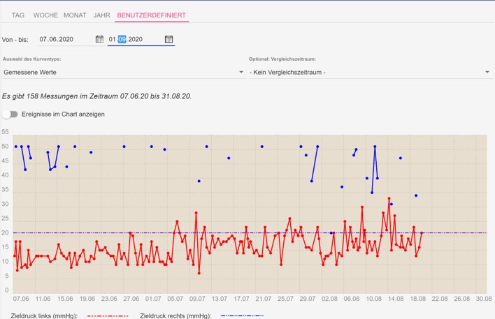 Abbildung 9: Verlauf der Augendruckwerte über frei wählbare Zeitintervalle und mit unterschiedlichen statistischen Auswertungen sehen und auf dem Hintergrund von bestehenden Risikofaktoren bzw. Zieldruckangaben sehen.