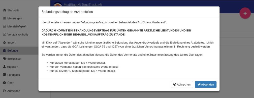 Abbildung 11: Befundauftrag an den Augenarzt mit Eingehen eines Behandlungsauftrages in der inApp-Funktion von SmartTonoTracker® .