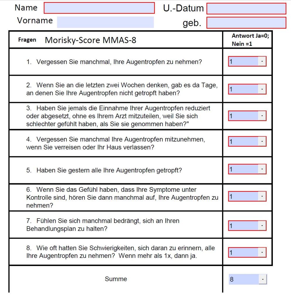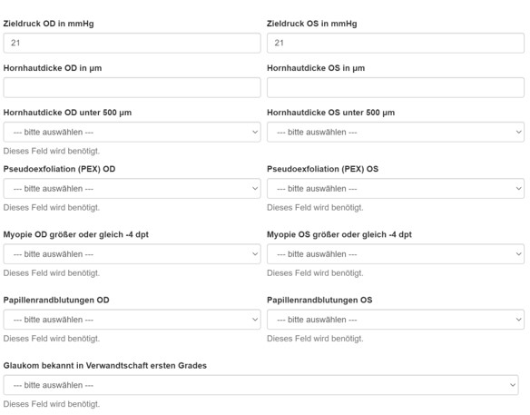 - Optional Dokumentation von Glaukom-Risikofaktoren und Zieldruck durch Arzt