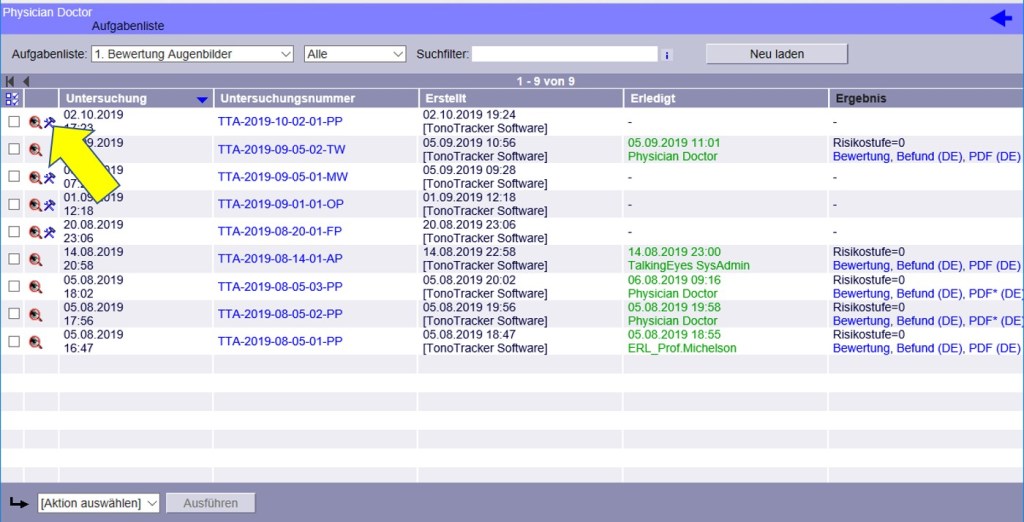 Unter AUFGABEN > Bewertung Augenbilder > Offene wird die Liste seiner noch offenen Befundungsanfragen dargestellt.