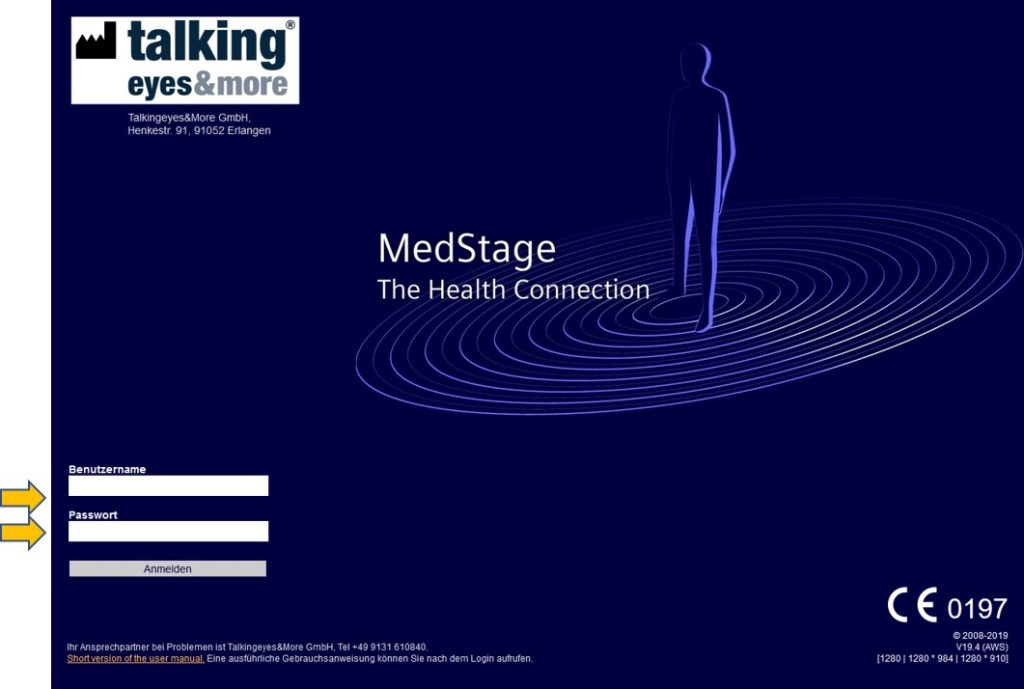 Die Liste von noch durchzuführenden Befundungsanfragen und die Befundung durch den Arzt erfolgt in MedStage®Core. SIEHE HANDBUCH FÜR ÄRZTE. Die Anmeldung in MedStage®-Core erfolgt mit dem Benutzernamen und Passwort für MedStage-Core, das der Arzt vom Hersteller Talkingeyes & More GmbH zugeschickt bekommen hat. Die Kurzversion der Gebrauchsanleitung kann ohne Login heruntergeladen werden mit KLICK auf „SHORT VERSION OF THE USER MANUAL“ Die Langversion der Gebrauchsanleitung kann nur nach erfolgreichen Login heruntergeladen werden mit KLICK auf das Icon >?< und dann mit Klick auf „DOWNLOAD der Gebrauchsanweisung“
