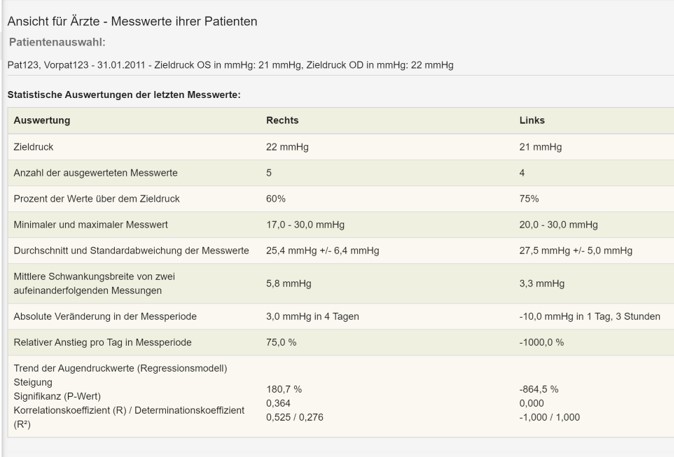 Bessere Beurteilung des Verlaufes durch zusätzliche statistische Auswertung der Werte: Der Arzt kann den Verlauf der Augendruckwerte über frei wählbare Zeitintervalle und mit unterschiedlichen statistischen Auswertungen sehen und auf dem Hintergrund von bestehenden Risikofaktoren bzw. Zieldruckangaben sehen. Weiterhin erlaubt die statistische Trendanalyse das Erkennen von einem signifikanten Trend zu höheren Druckwerten, obwohl der Zieldruck noch nicht überschritten wurde.