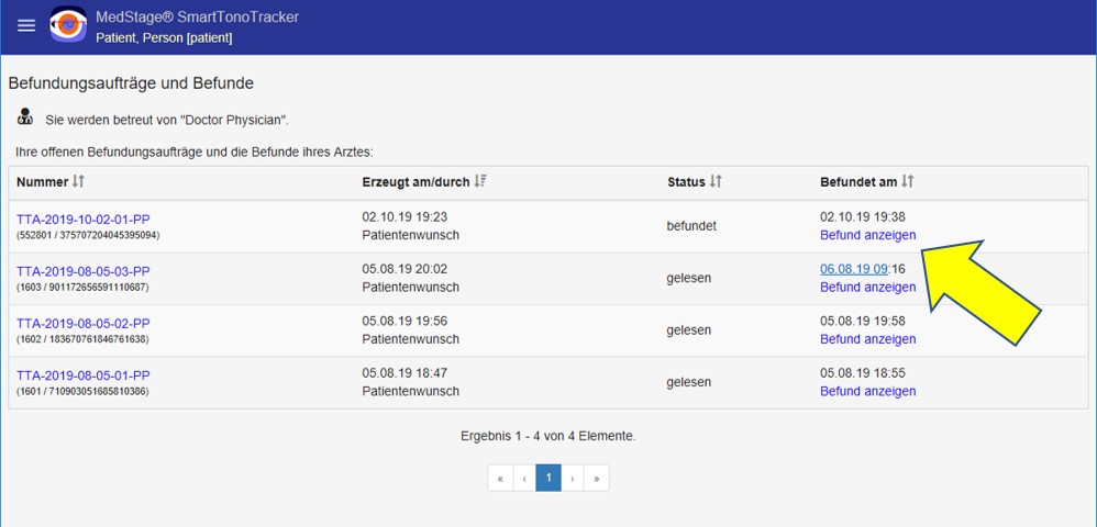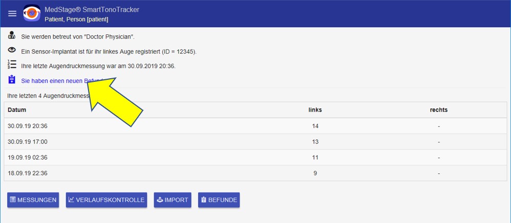 Der Patient mit der SmartTonoTracker-in-App-Funktion BEFUNDE eine tele-augenärztliche Fernbeurteilung vom Tele-Ophthalmologischen Institut seiner Daten kostenpflichtig anfordern.