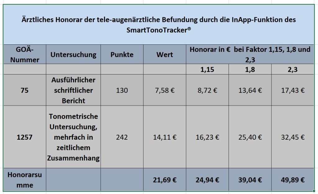 Die digitale Applikation SmartTonoTracker® kann von Patienten und Ärzte genutzt werden. Die Rolle des Patienten bei inApp-Funktion ist die Auslösung eines Befundungsauftrages an seinen Augenarzt. Die inApp-Funktion ermöglicht, dass der Patient bei Bedarf – zB. bei hohen Augendruckwerten- einen Befundungsauftrag an seinen Arzt auslöst und damit gleichzeitig einen Behandlungsvertrag für diese Leistung abschließt. Diese Leistung ist zusätzlich als GOÄ-Leistungen kostenpflichtig. Nach Durchführung der tele-augenärztlichen Befundung kann der Patient den Arztbrief als PDF auf der digitalen Anwendung lesen, ausdrucken oder speichern.