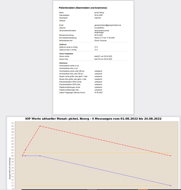 - klinische Daten und Augendruckwerte in menschenlesbarer Form als PDF und in maschinenlesbarer Form für die elektronische Patientenakte ePA.