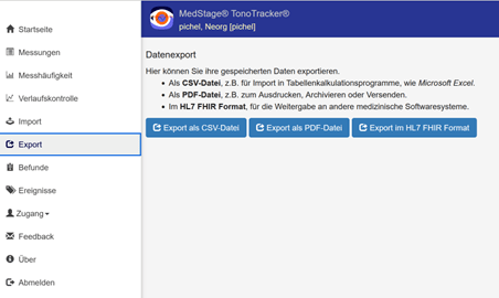 Mit der EXPORT-Funktion kann der Patient die gespeicherten Daten selbst exportieren.