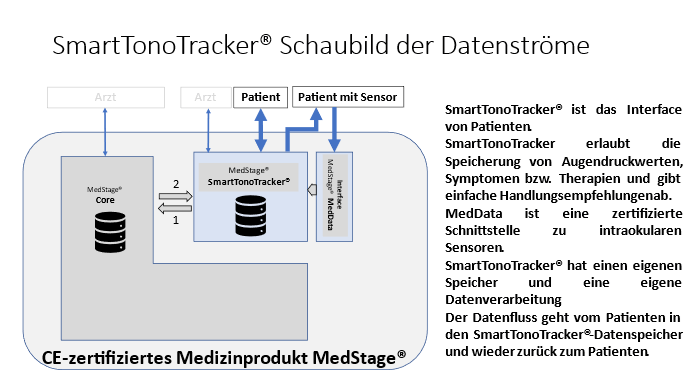 Der SmartTonoTracker® besteht aus gebündelten Funktionen von MedStage®. MedStage®besteht aus vielen Funktionen. Durch Bündelung von bestimmten Funktionen von MedStage® entstehen Komponenten. MedStage® besteht aus der Komponente MedStage® Core, der Komponente SmartTonoTracker® und der Komponente MedData. Am 11.3.2020 wurde MedStage® um mehrere Funktionen (Komponente SmartTonoTracker und Komponente MedData) erweitert. Diese Funktionen sind Teil von MedStage® und können bei geeigneter Konfiguration von MedStage vollständig eigenständig arbeiten. MedStage® hat für Patienten und Ärzte nur 2 sichtbare Module, da Modul 3 (MedData) eine für Arzt und Patient unsichtbare Schnittstelle ist. MedData ist eine Schnittstelle ausschließlich zur Datenübertragung zwischen intraokularen Sensoren und der SmartTonoTracker-Datenbank. Die Übertragung von Daten aus dem Sensor kann nur vom Patienten angestoßen werden. SmartTonoTracker® dient dazu, (1) Augendruckwerte oder andere Daten zu speichern, (2) die gespeicherten Augendruckwerte oder Risikofaktoren zu präsentieren und (3) einfache Handlungsempfehlungen an den Patienten zu geben. Die Eingabe und Speicherung von Daten aus Sensoren oder Geräten in SmartTonoTracker® kann händisch als Einzelwert oder durch Upload einer xml-/csv-Datei mit definiertem Format erfolgen, oder automatisch über die technische Schnittstelle mit definiertem Format von Sensoren oder Geräten oder intraokularen Augendrucksensoren. Nur autorisierte Personen mit Passwort und ID haben Zugang zum System.