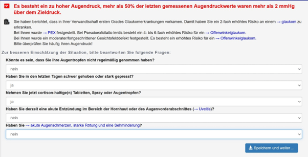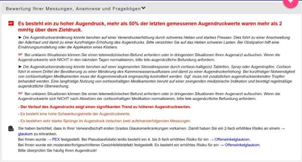 Dem Nutzer werden kontextsensitive Hinweise auf Risiken gegeben. Bei Konstellationen von erhöhten Augeninnendruckwerten und vorliegenden Risikofaktoren wird auf das erhöhte Risiko einer Glaukomerkrankung hingewiesen.
