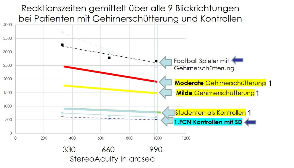 Im Laufe der Zeit verbesserte sich die Okulomorik hinsichtlich Fusionsfähigkeit und Reaktionszeit. Eine Woche nach dem stumpfen SHT waren die Reaktionszeiten signifikant besser als direkt bei stationärer Aufnahme. Zwei Monate später kam es zu einer weiteren signifikanten Besserung der Reaktionszeiten. Vor allem in den Blickrichtungen nach links und rechts war das Verschmelzen der Bilder des RA und LA (Fusion) nicht möglich bei stationärer Aufnahme. Bei beiden Gruppen kam es nach 2 Monaten zu einer Normalisierung der Fusion der Bilder vom RA und LA und damit zu einem Stereosehen bei Seitblick.